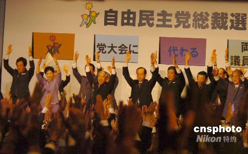 9月22日下午,日本自民黨總裁選舉中,第4次參選的麻生太郎以351票的高票當選該黨第23任總裁。中新社發(fā) 朱沿華 攝