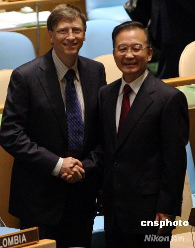 25日,中國總理溫家寶出席聯合國千年發展目標高級別會議時與前微軟總裁比爾·蓋茨進行短暫交談。中新社發 李靜 攝