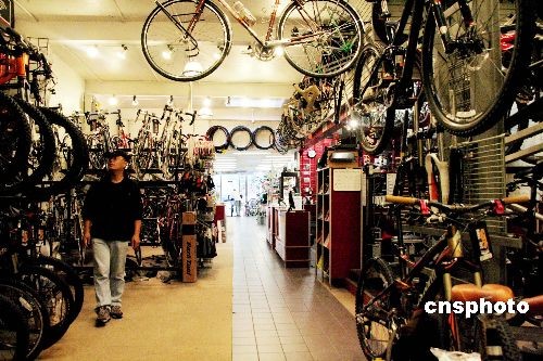 美國經濟不景氣,不但催熱了二手商品店和打折網站,也火了自行車行。紐約中城三十四街一家自行車行里,小小兩百平米,擺了不下八十輛自行車。店員說,上個月天氣更暖和的時候,店里平均每天能賣二十輛自行車,“這可是以前不多見的”。五百美元左右的中等價位車最受歡迎,買車人的人不少就在附近的寫字樓里上班。中新社發 魏晞 攝