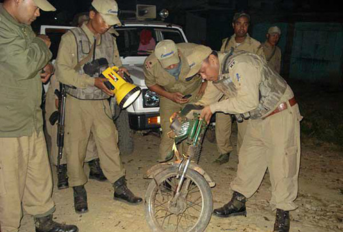 士兵在印度東北部城市因帕爾發(fā)生爆炸的地點檢查。