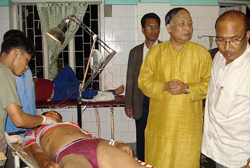 10月21日,在印度東北部城市因帕爾的醫(yī)院,當(dāng)?shù)毓賳T看望在爆炸中受傷的人。