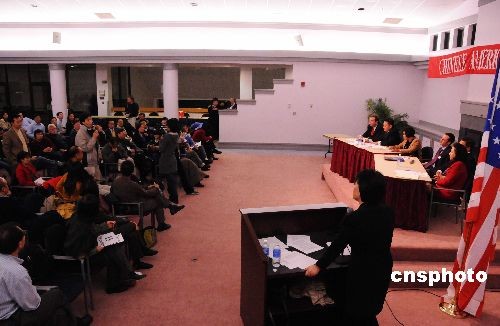 當?shù)貢r間十月二十八日晚,兩黨競選陣營代表在此間和美籍華人社區(qū)領(lǐng)袖舉行特別會議,就兩黨的競選政策回答了華裔選民關(guān)注的問題。圖為民主共和兩黨競選陣營代表和華裔選民交流。中新社發(fā) 邱江波 攝