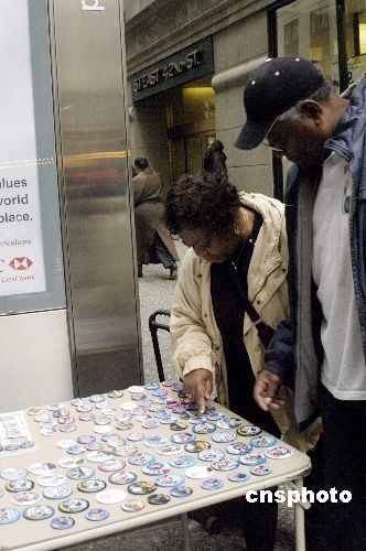 11月3日,美國大選前一天,民眾在紐約街頭購買印有總統候選人頭像的胸章。中新社發 魏晞 攝