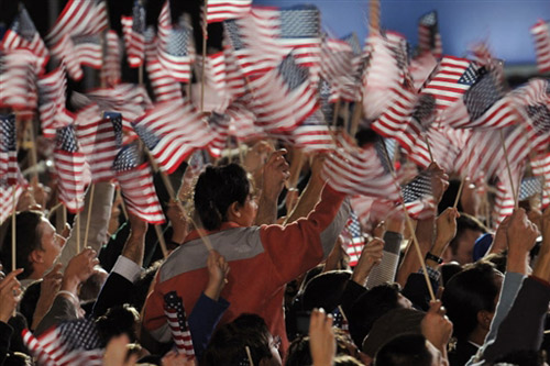 美國總統選舉結果揭曉,奧巴馬已經贏得足夠的選舉人票(270票),取得本屆美國總統大選的勝利。他將成為美國首位黑人總統。圖為支持者慶祝奧巴馬的獲勝