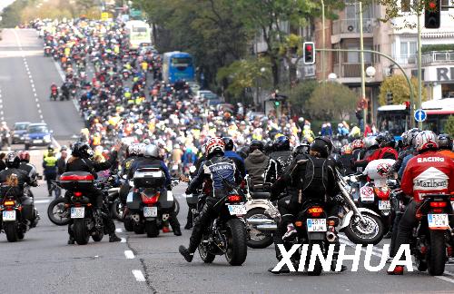 11月8日,眾多摩托車手在西班牙首都馬德里市中心街道參加大游行。當日,來自西班牙各地的上萬名摩托車手在首都馬德里參加大游行,呼吁政府部門改善道路交通條件,保障摩托車出行安全。據統計,西班牙2007年共有500余名摩托車手在交通事故中喪生。新華社記者陳海通攝