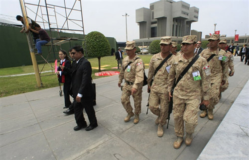 峰會期間,秘魯方面將安排3.9萬名警察在大街上巡邏,并用直升機將護送領(lǐng)導(dǎo)人衛(wèi)隊,而領(lǐng)導(dǎo)人們則將在戒備森嚴(yán)的秘魯國防部內(nèi)會面。