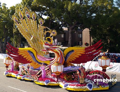 當(dāng)?shù)貢r間1月1日,第120屆美國帕薩迪娜玫瑰花車游行拉開2009新年序幕。游行隊伍由90個方陣組成,包括46輛花車、22支軍樂隊、18支騎術(shù)隊和5輛禮賓車,美輪美奐,精彩紛呈。臺灣中華航空公司的玫瑰花車“火鳳凰”,在花車游行中勇奪國際大獎。該花車名為“臺灣燈會”,花車上凸顯中國燈籠和“仙女下凡”,奪人眼球。中新社發(fā) 盧威 攝