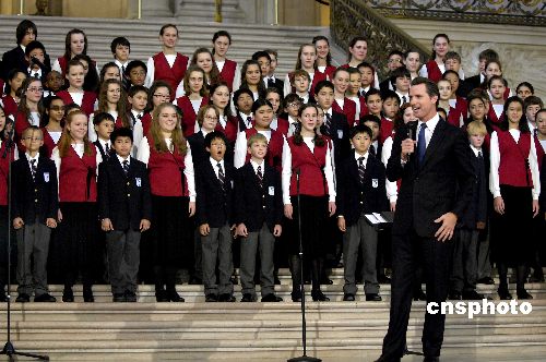 美國候任總統奧巴馬的就職典禮,將于當地時間一月二十日在首都華盛頓舉行。曾多次獲得格萊美獎的舊金山男童、女童合唱團應邀出席并擔任表演嘉賓。一月十五日下午,兩個合唱團的八十六名團員在舊金山市府大廳作啟程前的熱身演出,市長紐森為他們送行并稱贊小歌手們是舊金山的驕傲。紐森宣布當日是“舊金山男童合唱團和女童合唱團日”。中新社發 陳鋼 攝