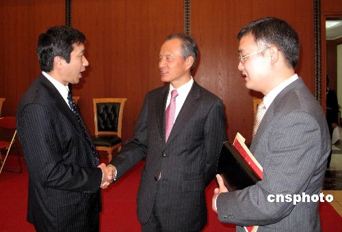 近日,中國駐日本大使崔天凱在東京舉辦2009旅日華僑華人新春招待會。會上,崔大使親切會見了日本人漢語征文大賽主辦者和贊助單位負責人,聽取他們的匯報。圖為崔大使會見大賽贊助單位社長。中新社發 段躍中 攝