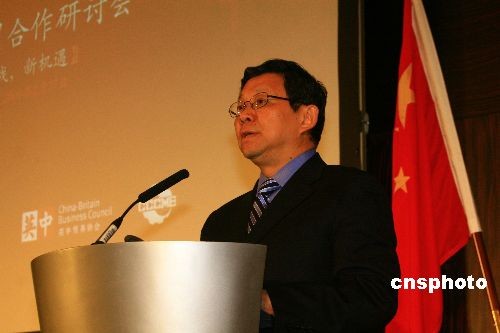 當(dāng)?shù)貢r間2月27日下午,中國機電進出口商會和英中貿(mào)易協(xié)會在倫敦共同舉辦中英經(jīng)貿(mào)合作研討會,中英兩國企業(yè)界人士600多人與會。圖為中國商務(wù)部長陳德銘在研討會上致辭。中新社發(fā) 李鵬 攝