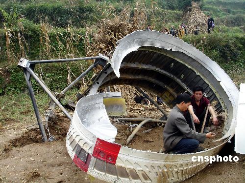 10月24日18時05分,在西昌衛星發射中心發射的“嫦娥一號”衛星,任務代號“07——34”,一級火箭殘骸成功著落于貴州福泉道坪鎮上平果村民組。殘骸 外殼著落于該村民組玉米地面,殘骸著落于一吳姓村民房屋中梁,全村民無人受傷。目前相關部門正在組織人員拆卸回收。中新社發 易勝武 攝