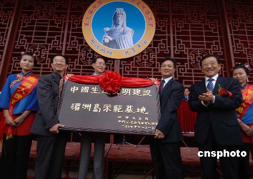 11月1日,中共中央委員、國家林業局局長賈治邦(右二)、中國生態道德教育促進會理事長陳壽朋(左三)在第九屆中國.湄州媽祖文化旅游節開幕式上共同為中國第一個生態文明建設示范基地——福建莆田湄洲島基地授牌。當天,媽祖故鄉福建莆田湄洲島成立了中國第一個生態文明建設示范基地。中新社發 劉可耕 攝