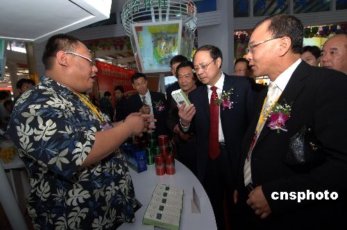 十一月十八日,臺灣商人陳志惟(左一)在閩臺農業合作成果館里向國務院臺辦副主任鄭立中(右二)介紹自己的產品。當日,第九屆海峽兩岸(福建漳州)花卉博覽會暨農業合作洽談會在福建漳州花博園開幕。中新社發 王東明 攝