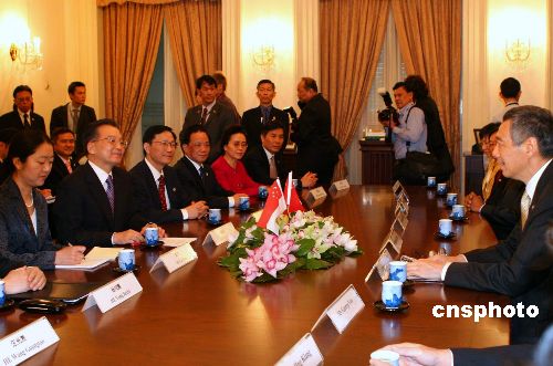 中國(guó)國(guó)務(wù)院總理溫家寶十一月十八日在此間與新加坡總理李顯龍舉行會(huì)談。雙方在友好、務(wù)實(shí)的氣氛中就進(jìn)一步加強(qiáng)兩國(guó)互利合作達(dá)成多項(xiàng)重要共識(shí)。中新社發(fā) 周群 攝