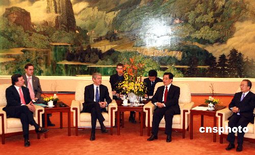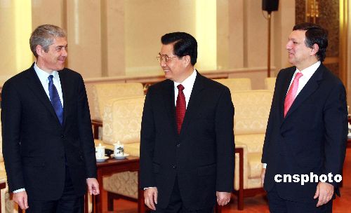 十一月二十八日,北京人民大會堂,中國國家主席胡錦濤會見歐盟輪值主席國葡萄牙總理蘇格拉底與歐盟委員會主席巴羅佐。他們是前來參加第四屆中歐工商峰會的。中新社發 廖文靜 攝