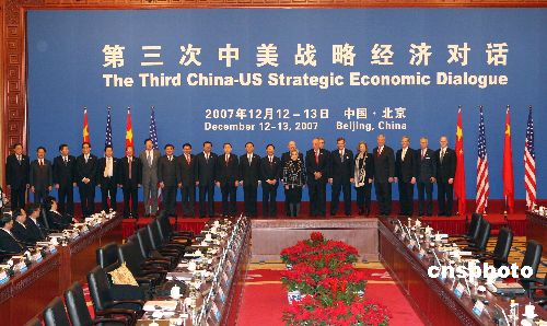 十二月十二日,第三次中美戰(zhàn)略經(jīng)濟(jì)對(duì)話在北京中信國(guó)安第一城開幕。會(huì)議開始前,中國(guó)國(guó)務(wù)院副總理吳儀(前右八)、美國(guó)財(cái)長(zhǎng)鮑爾森(前右七)與中美參會(huì)部長(zhǎng)高官們合影。中新社發(fā) 毛建軍 攝