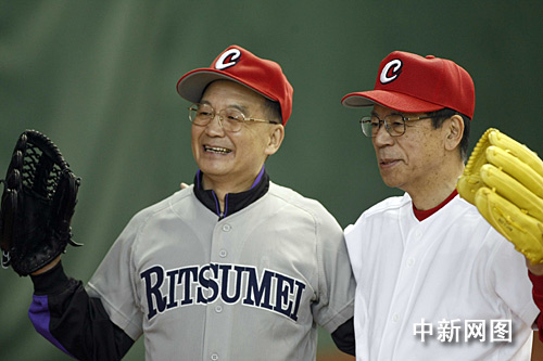 圖:溫家寶與福田康夫切磋棒球球藝