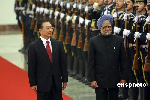 1月14日,中國國務(wù)院總理溫家寶在北京人民大會(huì)堂舉行儀式,歡迎來訪的印度總理辛格。中新社發(fā) 盛佳鵬 攝