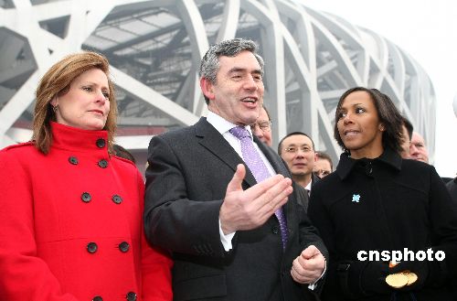 1月19日,英國首相布朗攜夫人薩拉·布朗以及英國著名女運動員、雅典奧運會冠軍凱莉·霍爾姆斯等,參觀2008年北京奧運會主體育場“鳥巢”。北京市副市長陳剛向布朗贈送了“鳥巢”模型。中新社發 盛佳鵬 攝