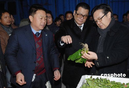 二月二日下午,中國商務(wù)部副部長高虎城(右一)一行冒雨抵達(dá)深圳,考察深圳南山農(nóng)產(chǎn)品批發(fā)市場供港果菜基地,要求深圳政府及供應(yīng)商克服困難、保障香港市場的需求。深圳市政府副市長陳應(yīng)春表示,深圳人寧愿少吃,也要保障香港同胞不斷檔。中新社發(fā) 陳文 攝