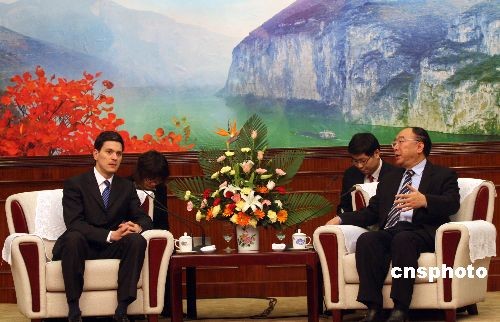 2月26日,英國(guó)外交大臣戴維·米利班德一行抵渝進(jìn)行訪(fǎng)問(wèn)。據(jù)稱(chēng),此次訪(fǎng)問(wèn)重點(diǎn)是了解重慶市政府在縮小城鄉(xiāng)差距領(lǐng)域所作出的努力,戴維·米利班德一行將實(shí)地走訪(fǎng)重慶建筑工地和農(nóng)村,了解當(dāng)?shù)剞r(nóng)民、農(nóng)民工及其子女的生活教育狀況。圖為重慶市常務(wù)副市長(zhǎng)黃奇帆(右一)會(huì)見(jiàn)戴維·米利班德(左一)。中新社發(fā) 郭晉嘉 攝