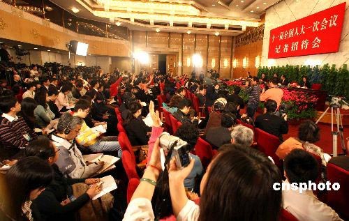 3月11日,十一屆全國人大一次會議新聞發布會在北京人民大會堂舉行。國家發展和改革委員會副主任解振華、國家環境保護總局副局長張力軍,就環境資源和節能減排問題回答記者提問。中新社發 張宇 攝