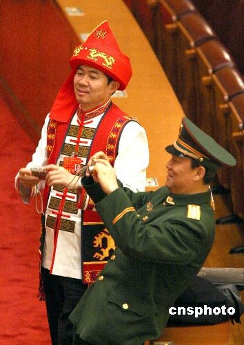 3月11日,出席十一屆全國人大一次會議第四次全體會議的軍人代表、少數(shù)民族代表,會后在人民大會堂拍照留念。中新社發(fā) 張宇 攝