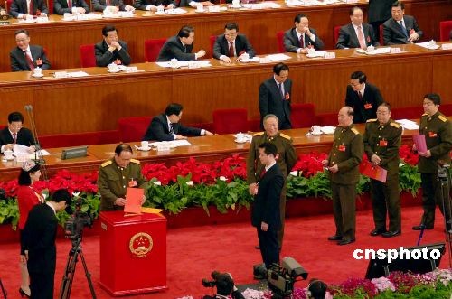 三月十五日上午,十一屆全國人大一次會議第五次全體會議在北京人民大會堂舉行,表決關于批準國務院機構改革方案的決定草案,選舉十一屆全國人大常委會委員長、副委員長,選舉國家主席、副主席及中央軍委主席等。中新社發 王東明 攝