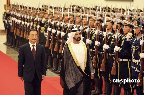 4月3日,國務院總理溫家寶在北京人民大會堂舉行儀式,歡迎阿聯酋副總統兼總理、迪拜酋長穆罕默德訪華。中新社發 任海霞 攝