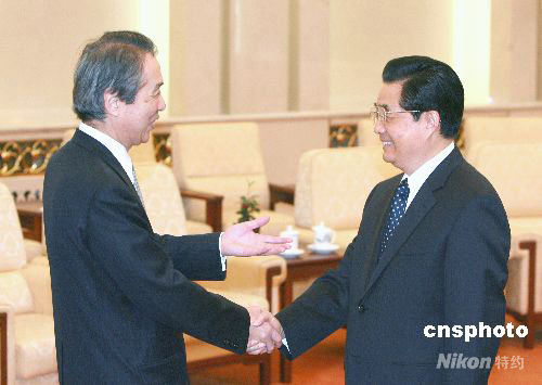4月16日,中國國家主席胡錦濤在北京人民大會堂會見以自民黨干事長伊吹文明、公明黨干事長北側一雄為團長的日本執政黨代表團。期間,伊吹文明向胡錦濤主席轉交了日本首相福田康夫的親筆信函。中新社發 廖文靜 攝
