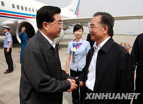 5月16日,中共中央總書記、國家主席、中央軍委主席胡錦濤乘飛機抵達四川綿陽,慰問災區干部群眾,看望抗震救災一線的部隊官兵和醫護人員。國務院總理溫家寶到機場迎接胡錦濤。 新華社記者鞠鵬攝