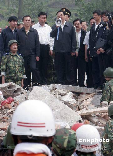 5月18日,中共中央總書記、國家主席、中央軍委主席胡錦濤來到四川什邡市鎣華鎮救災搶險現場察看災情,對當前救災工作提出要求,向參與現場救援的搶險救援突擊隊和空降兵某部官兵表示慰問。中新社發 張曉理 攝