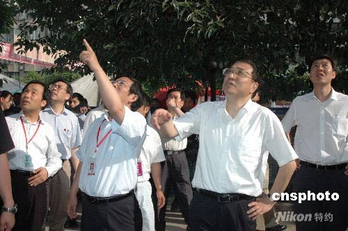 5月18日,中共中央政治局常委、國務院副總理、國務院抗震救災總指揮部副總指揮李克強(右)在四川長虹集團董事長趙勇的陪同下,看望住在長虹虹苑劇院里的職工。他關切地詢問這里是不是危樓。中新社發 肖龍聯 攝