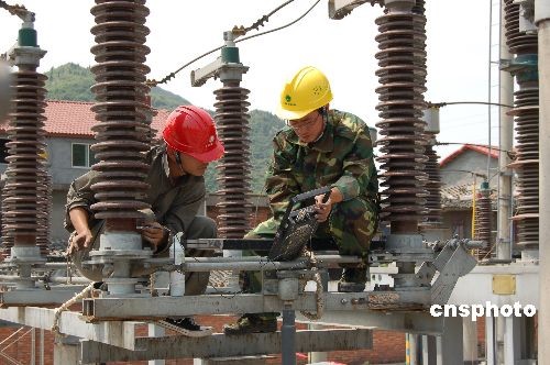 5月19日,江西電力搶修隊在110KV馬角壩變電站進行瓷瓶超聲波控傷、檢測。為使四川地震災區早日恢復供電,馳援的江西電力工人日以繼夜地堅持在搶修一線,抓緊時間加快電網的正常運行,盡快為災區人民恢復生活和生產用電。