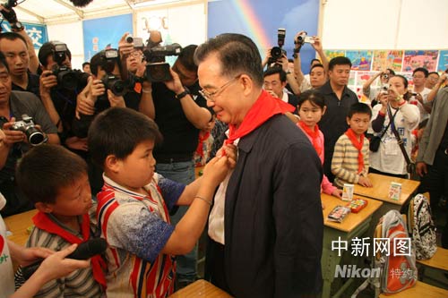 五月二十三日,正在四川地震災區考察的國務院總理溫家寶來到綿陽九洲體育館,看望九洲帳篷學校的孩子們。圖為孩子們為溫家寶系上紅領巾。中新社發 齊彬攝