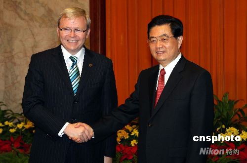 八月九日,中國(guó)國(guó)家主席胡錦濤在北京人民大會(huì)堂會(huì)見澳大利亞總理陸克文。中新社發(fā) 任海霞 攝