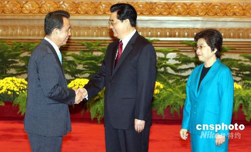 9月6日,國家主席胡錦濤夫婦在北京人民大會堂歡迎出席2008年殘奧會的各國貴賓。中新社發 任海霞 攝