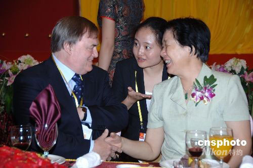 福建省政協主席梁綺萍女士與英國前副首相彭仕國相談甚歡。