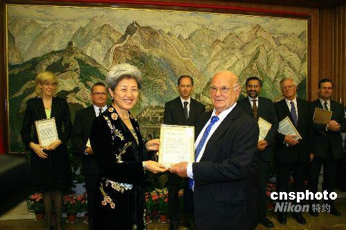當地時間9月25日晚,中國駐英使館舉行國慶59周年招待會。圖為中國駐英大使傅瑩(左)在招待會上向英外交部、國際發展部、英中貿協等機構代表及個人頒發中國民政部四川地震捐贈證書。中新社發 李鵬 攝