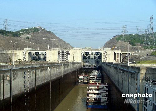 據長江三峽通航管理局消息,2008年10月3日下午,長江三峽雙線五級船閘由四級運行正式轉入五級運行。三峽工程自9月28日零時開始試驗性蓄水,水位從145米逐日抬升,截至10月4日15時已上升至154.25米。按照三峽船閘設計要求,三峽船閘在上游水位超過152.4米時,將由四級運行轉換為五級補水運行,同時,在152.4米到156米以下水位時仍可執行四級運行方式。三峽雙線五級船閘自2003年6月16日試通航,5年多來一直采用四級運行的方式。中新社發 劉君鳳 攝