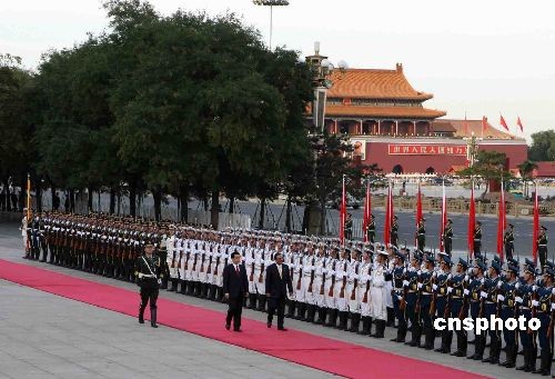10月15日下午,中國國家主席胡錦濤在北京人民大會堂東門外廣場舉行儀式,歡迎巴基斯坦總統扎爾達里訪華。扎爾達里總統是應胡錦濤的邀請從10月14日至17日對中國進行國事訪問,這是扎爾達里就任總統后的首次正式出訪。中新社發 任晨鳴 攝
