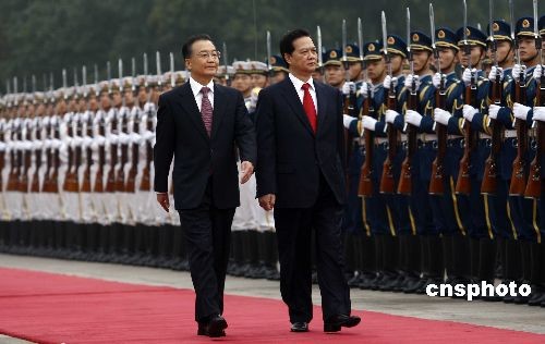 10月22日,中國(guó)國(guó)務(wù)院總理溫家寶在北京人民大會(huì)堂東門(mén)外廣場(chǎng)舉行儀式,歡迎越南總理阮晉勇。中新社發(fā) 盛佳鵬 攝
