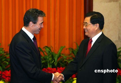 10月22日,中國(guó)國(guó)家主席胡錦濤在北京人民大會(huì)堂會(huì)見(jiàn)前來(lái)出席第七屆亞歐首腦會(huì)議的丹麥?zhǔn)紫嗬鼓律V行律绨l(fā) 廖文靜 攝