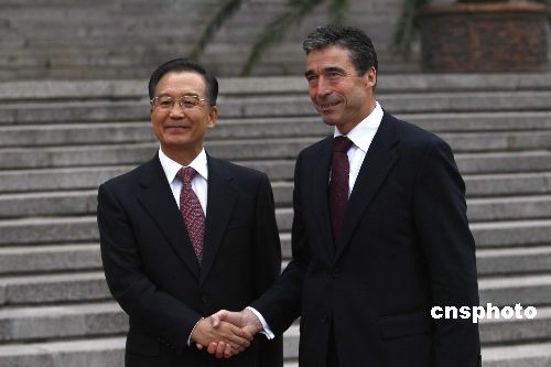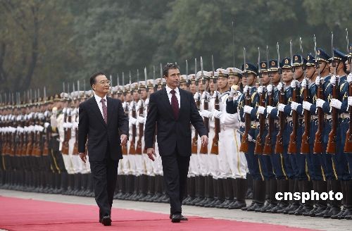10月22日,中國國務院總理溫家寶在北京人民大會堂東門外廣場舉行儀式,歡迎丹麥首相拉斯穆森。中新社發 盛佳鵬 攝