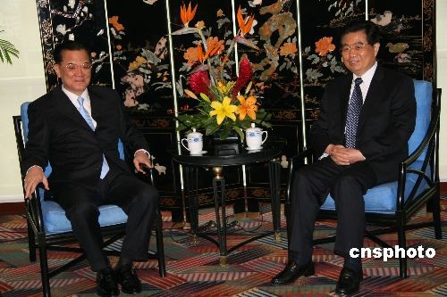 胡錦濤與夫人劉永清,當地時間二十一日上午在秘魯首都利馬同連戰和夫人連方瑀會面,這是胡錦濤與連戰的第六次會面,也是今年以來兩人第三次會面。中新社發 齊彬 攝