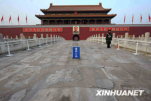 據北京市文物局9日透露,為迎接2009年國慶60周年,確保游客和文物安全,北京市文物局已于近日啟動了天安門金水橋加固修繕工程,整個工程預計將于2009年5月完工。天安門金水橋是整個天安門景觀的重要組成部分,因游客眾多以及風化等自然因素,天安門金水橋橋面此前多處出現破損,欄桿部分也出現裂縫,存在一定的安全隱患。新華社記者羅曉光攝