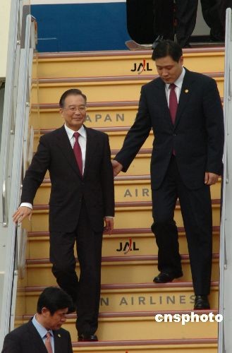 當(dāng)?shù)貢r(shí)間12月13日上午11點(diǎn)20分許,中國總理溫家寶抵達(dá)福岡機(jī)場準(zhǔn)備出席即將舉行的中日韓三國領(lǐng)導(dǎo)人會(huì)議,受到數(shù)十位當(dāng)?shù)厝A人華僑的熱烈歡迎。中新社發(fā) 朱沿華 攝