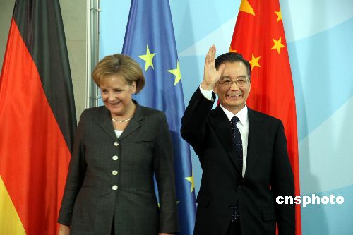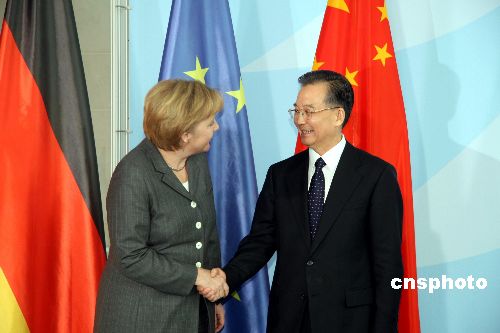 中國國務院總理溫家寶二十九日在柏林和德國總理默克爾進行了會談,中德兩國簽署了共同努力穩定世界經濟形勢的聯合聲明和氣候、交通等合作項目文件。中新社發 吳衛中 攝
