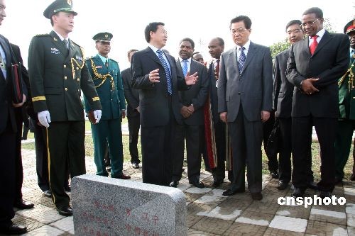 正在坦桑尼亞進行國事訪問的中國國家主席胡錦濤,二月十五日在坦桑尼亞總統基奎特陪同下,專程前往位于首都達累斯薩拉姆市郊的中國援坦專家公墓憑吊。圖為胡錦濤主席在靳成威烈士的墓前久久佇立,他動情地說:“靳成威同志,我代表你的家屬來看你了!”中新社發 齊彬 攝