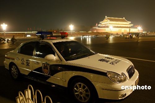 3月3日晚,北京警方在天安門廣場周邊加強夜間巡邏,確!皟蓵卑踩V行律绨l 鄭雄增 攝